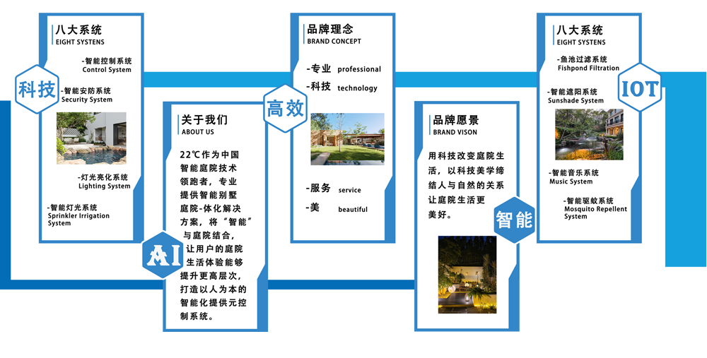 智能控制中心、灯光亮化系统、智能音乐系统、智能安防系统、智能喷灌系统、监控安防系统、遮阳降温系统等系统。